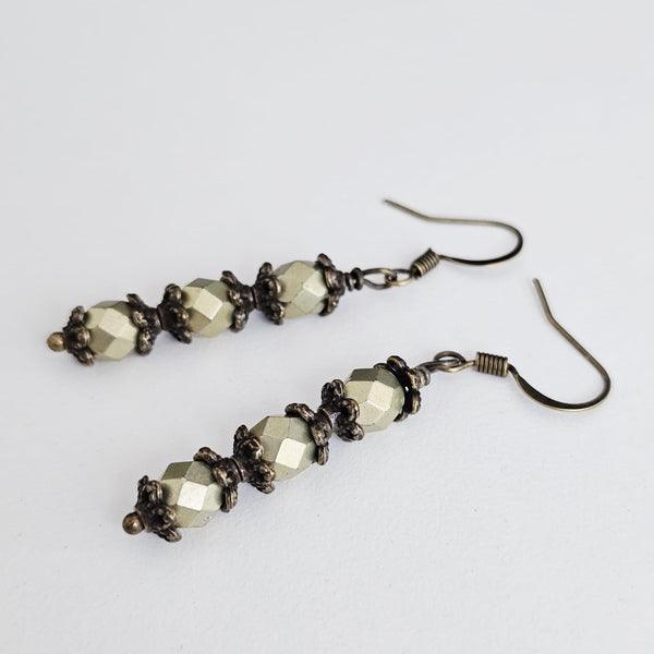 Features 6mm faceted round czech crystal beads and antique bronze metal parts.