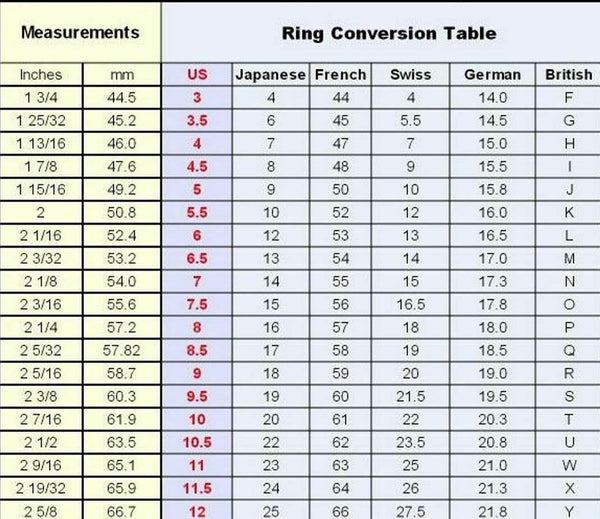 We use the U.S. Ring Sizing system . Below is a ring size comparison chart for